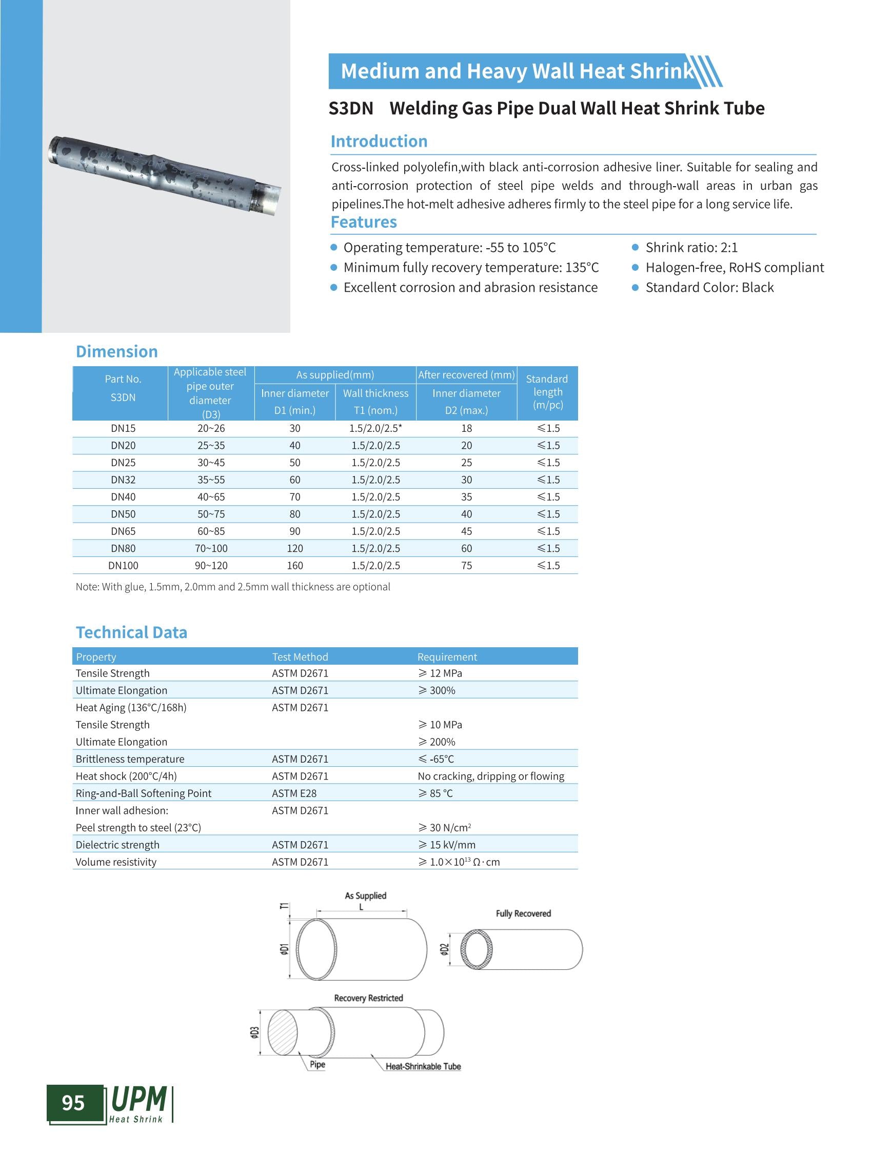 Introduction Cross-linked polyolefin,with black anti-corrosion adhesive liner. Suitable for sealing and anti-corrosion protection of steel pipe welds and through-wall areas in urban gas pipelines.The hot-melt adhesive adheres firmly...