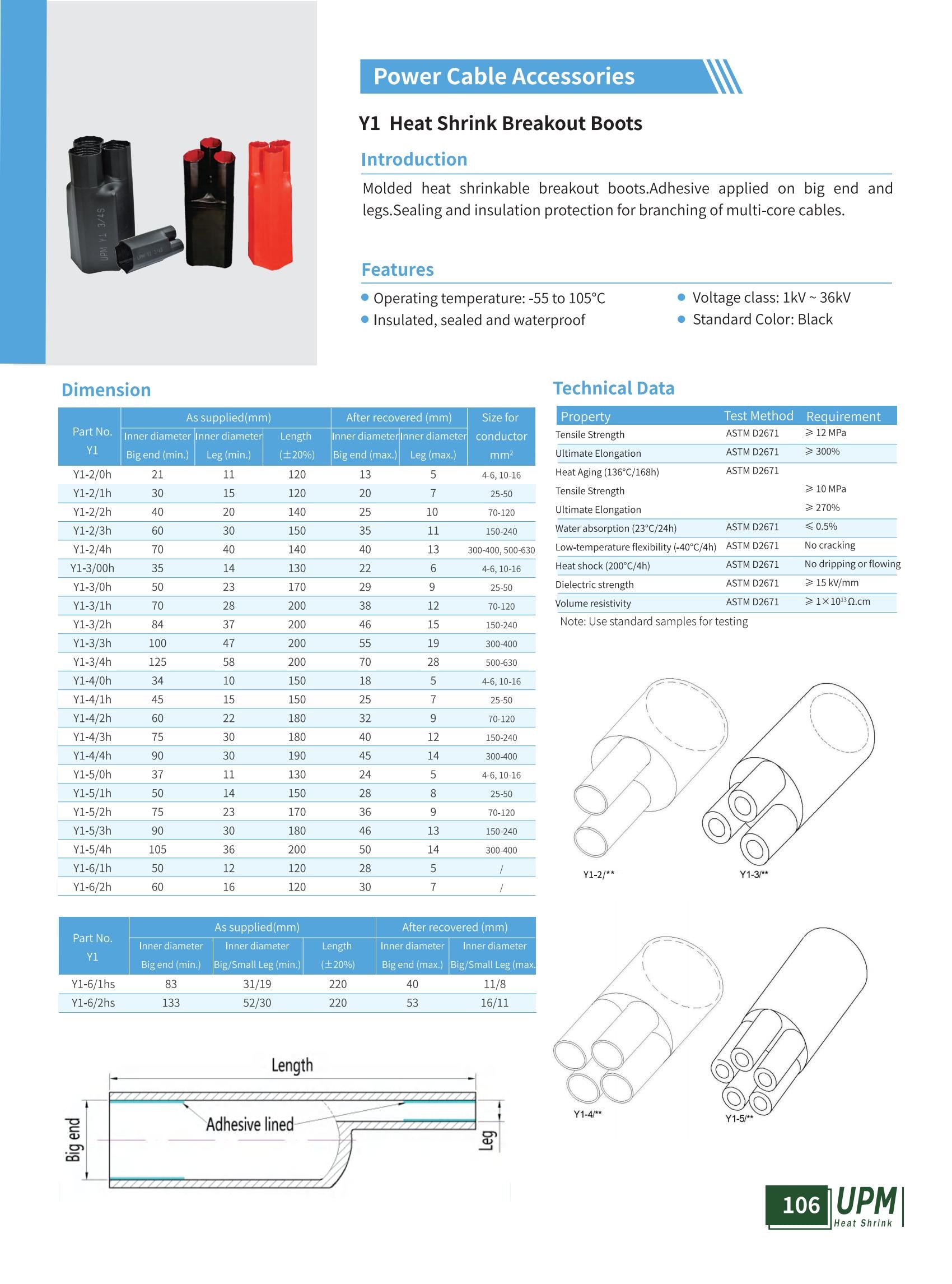 Introduction Molded heat shrinkable breakout boots.Adhesive applied on big end and legs.Sealing and insulation protection for branching of multi-core cables. Features Operating temperature: -55 to 105°C Voltage class:...