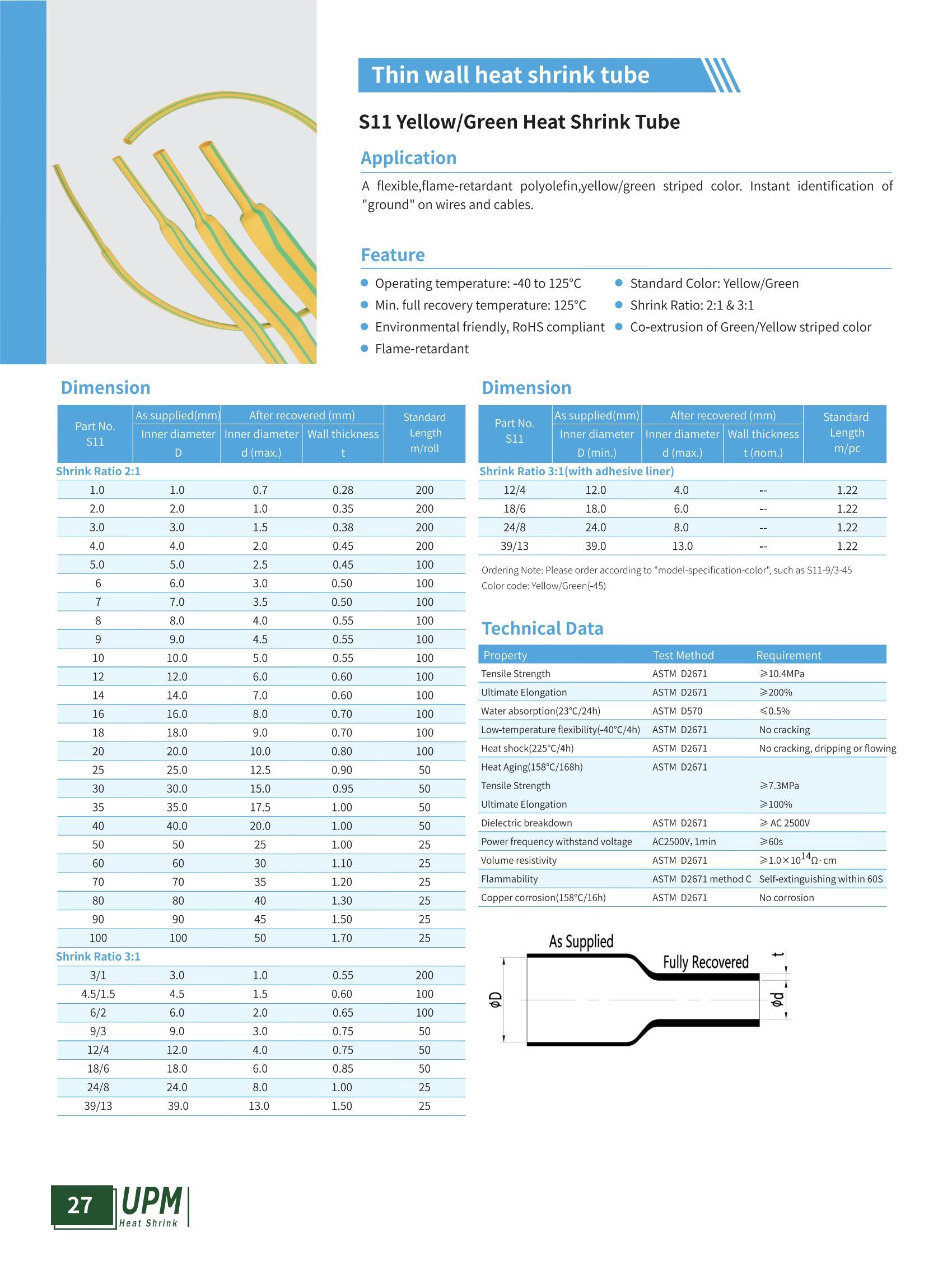 Introduction A flexible,flame-retardant polyolefin,yellow/green striped color. Instant identification of "ground" on wires and cables. Features Operating temperature: -40 to 125°C Minimum full recovery temperature: 125°C Shrink ratio: 2:1...