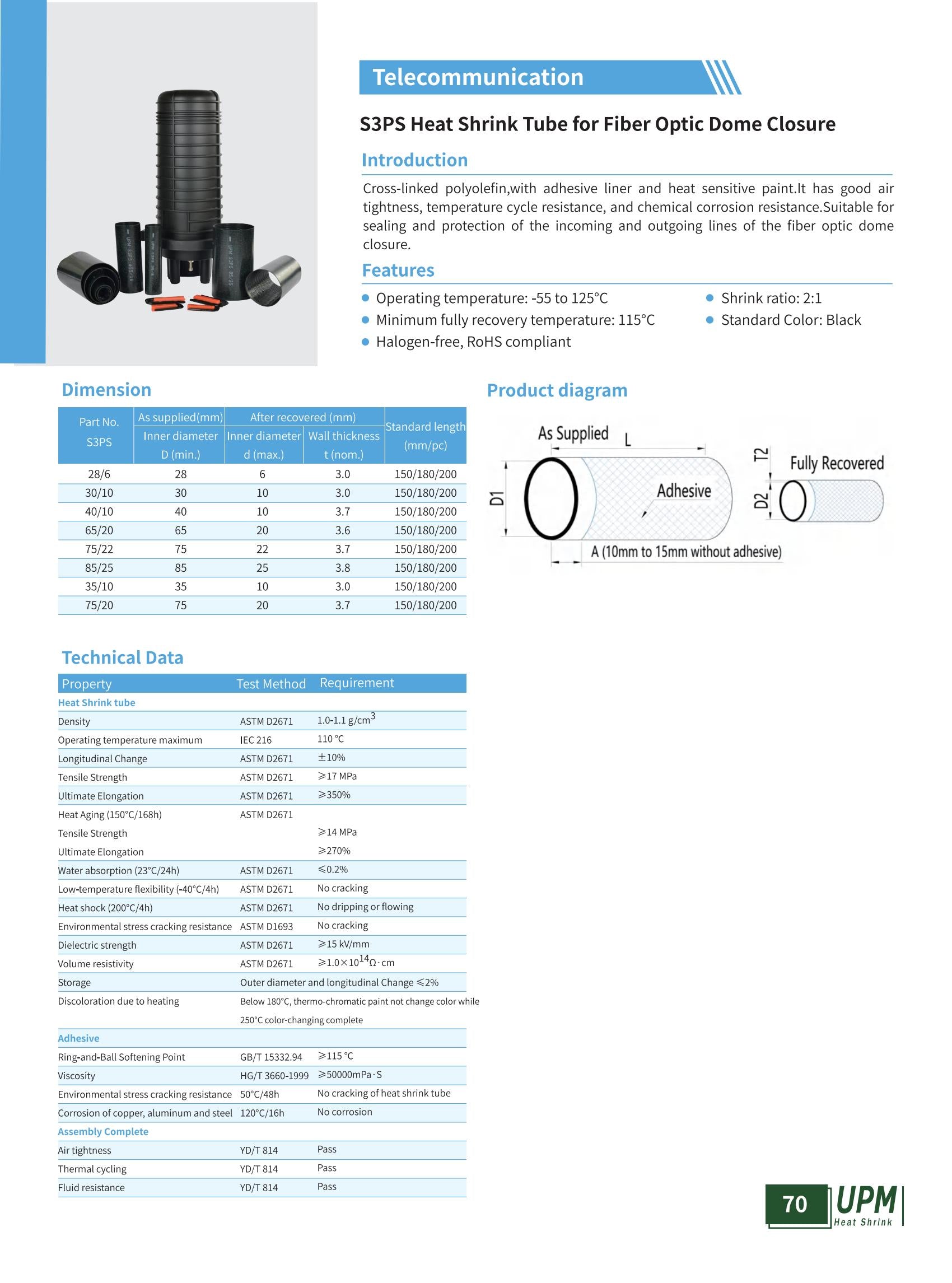 Poliolefina reticulada, con revestimiento adhesivo y pintura sensible al calor. Tiene buena estanqueidad al aire, resistencia al ciclo de temperatura y resistencia a la corrosión química. Adecuado para sellar y proteger las líneas entrantes y salientes del cierre del domo de fibra óptica.