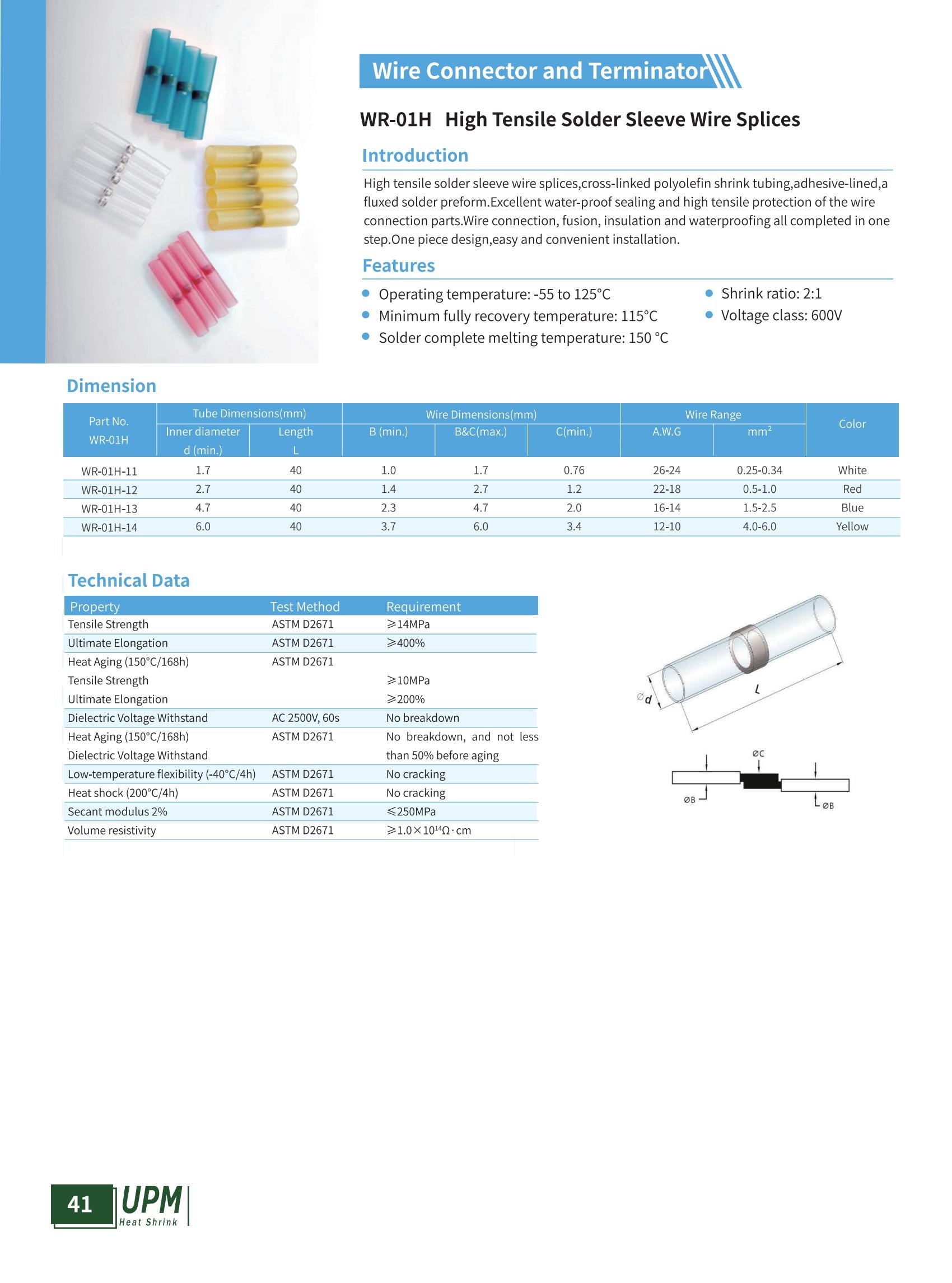 Introduction High tensile solder sleeve wire splices,cross-linked polyolefin shrink tubing,adhesive-lined,a fluxed solder preform.Excellent water-proof sealing and high tensile protection of the wire connection parts.Wire connection, fusion, insulation and...